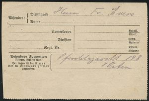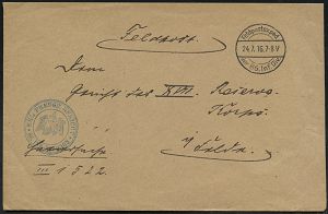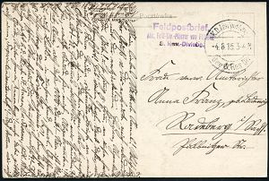| 500 | 12 € | I. WELTKRIEG 1914 - 18 : ÖSTERREICH 1916 (ca.) viol. Ra.2: Kriegsdienst/portofrei + HdN: K.u.k. Kavallerieschützen Ers. ESK des Drag.(oner) Regts. Nr.97 , Feldpost-Bf. n. Berlin! | | |