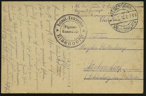 | 350 | 14 € | I. WELTKRIEG 1914 - 18 : ELSENBORN-/ ÜBUNGSPLATZ 1916 (15.7.) 1K-Steg = Hauspostamt Truppenübungsplatz + viol. 3K-HdN: Heimat-Kompanie/ Pionier-/Kommando/Elsenborn + hs. Abs.: "...Pionierkommando Elsenborn", klar gest., individuelle Foto-Feldpost-Ak.: Pionier-Gruppenfoto n. Stakendorf | | |