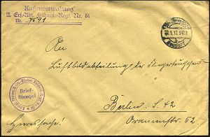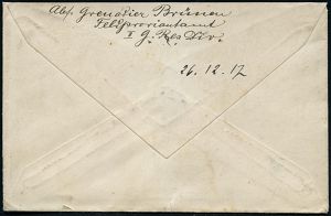 | 437 | 20 € | I. WELTKRIEG 1914 - 18 : DEUTSCHES REICH 1917 (2.11.) 1K-Brücke: Deutsche Feldpost/* 733 * + gez. RZ: Deutsche/ Feldpost Nr.733 + 2x viol. HdN: INFANT: REGT: KAISER WILHELM (GROSS.HESS. No.116 + Ra.2: S.B./ I. J. R. 116. (Bf. Vertikalfalte), dekorativer, quadratischer Heeresdienst-R-Bf. (rs. Klappenriß) an F.P.-Amt 45 | | |