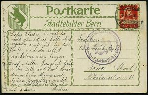 | 505 | 12 € | I. WELTKRIEG 1914 - 18 : SCHWEIZ 1915 (4.10.) 10 C. Tell (gest. BASEL 2) + viol. 1K-HdN: Frankfurt (Main)/ Überwachungsstelle des XVIII. Armee-Korps (Wo.31) Ausl.-Zensur-Kt. (UPU-Denkmal, Bern) n. Trier (Wo.31) | | |