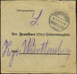 | 353 | 15 € | I. WELTKRIEG 1914 - 18 : FRANKFURT (ODER)/ POSTVERTEILUNGS-/ STELLE 1915 (März) 1K-Brücke mit Segment unten auf Vorbindezettel: Von Frankfurt (Oder) Postverteilungsstelle (übliche kl. Randknitter) selten! (Form C 47 c) | | |