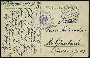 | 399 | 15 € | I. WELTKRIEG 1914 - 18 : DEUTSCHES REICH 1915 (27.10.) 1K-Brücke: K. D. Feldpostexp./30. Reserve-Div. (Nr.1197) + viol. 1K-HdN: KÖNIGL. PREEUSS./ K R I E G S K A S S E / XV, RES.-KORPS (Adler) klar gest. Color-Feldpost-Ak.: Vogesen.. Schlafgemach in Offz.-Unterstand (Birkenmöbel!) n. M.-Gladbach | | |