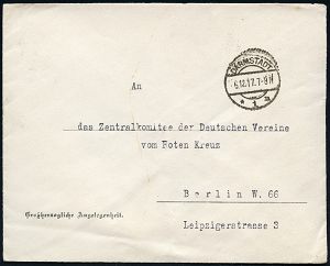 | 343 | 16 € | I. WELTKRIEG 1914 - 18 : BERLIN W/ *50a 1916 (9.3.) 1K-Gitter + viol. 1L: Heeressache!, rs. rote Siegeloblate: ..KAISERL. KOMMISSARS U. MILIT.-INSPEKTEURS / D. FREIW.(ILLIGEN) KRANKENPFLEGE (Brustschild-Adler) portofreier Dienstbf. n. Barmen | | |
