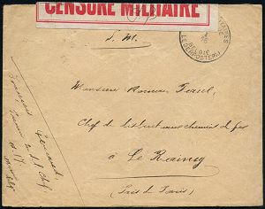 | 468 | 20 € | I. WELTKRIEG 1914 - 18 : BELGIEN 1918 (Okt.) Feldpost-1K: POSTES MILITAIRES/BELGIQUE/I/BELGIE/LEGERPOSTEREIJ + hs. Abs. + roter Zensur-Zettel: CENSURE MILITAIRE (Wolter unbekannt) Ausl.-Feldpost-Zensur-Bf. n. Frankreich, rs. AS.: LE RAINCY | | |