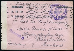 | 485 | 20 € | I. WELTKRIEG 1914 - 18 : GROSSBRITANNIEN 1918 (3.9.) Band-MaSt.: TOOTING S.W. 17 + Zensurstreifen: OPENED BY/CENSOR,/P W 1257 (für Kgf.-Sendungen, Wo.2) + viol. Zensur-1L: Gerüft = Saarbrücken (Wo. unbekannt!), Ausl.-Kgf.-Zensur-Bf. an Offiziers-Kgf.-Lager Saarbrücken | | |