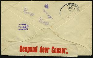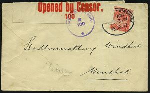 | 508 | 18 € | I. WELTKRIEG 1914 - 18 : SÜDWESTAFRIKA / SÜDAFRIKA 1917 (13.10.) aptierter, deutscher Bahn-Oval: - WINHOEK/ POST , EF 1 P. Georg V. Südafrika = Vorläufer + Zensur-Streifen "Opened by Censor/100" (Wo.5) + viol. 1K: PASSED CENSOR/B/100/* (Wo.3, vs. gr.Riß geschl.), Orts-Zensurbf., rs. apt., deutscher Bahn-Oval: - WINDHOEK (als AS) | | |