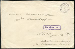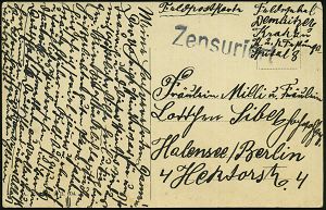| 368 | 20 € | I. WELTKRIEG 1914 - 18 : OBERSTEIN/ *** 1914 (12.10.) 1K-Gitter + schw. Zensur-Ra.2: G.P.C. Oberstein/ Geprüft und zu befördern (Rie.1) seltene Inl.-Zensur-Feldpost-Kt. n. Lübbecke, Zensurstelle war nur 1914 bis Feb. 1915 aktiv! | | |