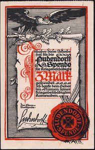 | 422 | 12 € | I. WELTKRIEG 1914 - 18 : DEUTSCHES REICH 1917 Spendenquittung "3 Mark Ludendorff=Spende" für Kriegsbeschädigte (Adler, Siegel) rs. Unterschrift | | |