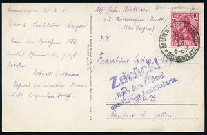 | 371 | 35 € | I. WELTKRIEG 1914 - 18 : MÜNSINGEN (WÜRTT.)/ *ÜBUNGSPLATZ* 1918 (23.2.) 1K = Hauspostamt Truppenübungsplatz auf EF 10 Pf. Germania + viol. 3L: Zurück!/Nach dem Ausland/unzulässige Ansichtskarte. (= Rosen-Ak.!) seltene Ausl.-Retour-Kt. n. St. Gallen (Mi.86) | | |