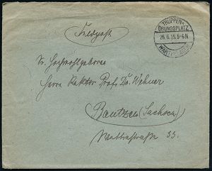 | 444 | 12 € | I. WELTKRIEG 1914 - 18 : DEUTSCHES REICH 1918 (12.10.) 2K-Steg: DEUTSCHE FELDPOST/* = Tarnstempel + viol. Abs.-2L: ..Ortskommandantur 229 , rs. hs. Abs. (Dt. Feldpost Nr. 426) später Feldpost-Falt-Bf. mit Inhalt n. Waalshof | | |