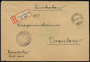 | 445 | 20 € | I. WELTKRIEG 1914 - 18 : DEUTSCHES REICH 1918 (23.10.) 1K: K. D. FELD-POSTSTATION/No 56 + gez. RZ: Deutsche Feldpost 56 + viol. 3K-HdN: Armee-Abteilung 6. Armee Oberkommando (rs. Abs.-Siegel ausgeschnitten) klar gest., später Heeresdienst-R-Bf. n. Dresden | | |