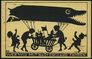 | 349 | 20 € | I. WELTKRIEG 1914 - 18 : DÜSSELDORF/ *1if 1915 (3.12.) 1K-Brücke auf Künstler-Propaganda-Ak.: WER WILL MIT NACH ENGLAND FAHREN? = Krokodil als Zeppelin, Kinder mit Leiterwagen und Soldaten-Puppen = Schattenriß, sign. M E = M(artha) E(beling), Düsseldorf (Sekretariat Sozialer Studetenarbeit, M.-Gladbach) Bedarf, selten! | | |