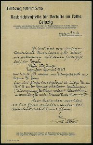 | 362 | 18 € | I. WELTKRIEG 1914 - 18 : Leipzig 1916 (9.11.) orig. Briefbogen: Feldzug 1914-15-16 Nachrichtenstelle für Verluste im Felde Leipzig , hs. Mitteilung: "Gefreiter des Inf. Regts. 189/9.. für das Vaterland .. infolge der am 16.10.16 an der Somme erhaltenen Verletzung.." (verstorben ist) = WAST-Vorläufer! (Format ca. 20,5 x 28,5 cm) | | |