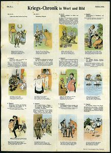 | 386 | 45 € | I. WELTKRIEG 1914 - 18 : DEUTSCHES REICH 1914 Color-Propaganda-Plakat Nr.1 "Kriegs-Chronik in Wort und Bild" in Comic-Manier vom 28. Juli (Kriegserklärung an Serbien) bis zum 9. August (brit. Bulldogge besetzt Togo) insges. 12 Bilder der ersten Kriegstage (gefaltet, einige Stockflecken), Druck u. Verlag Ockelmann & Buss, Hambg. 23, selten! (Format ca. 38 x 52 cm) | | |