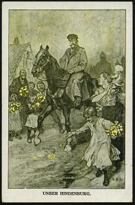| 392 | 16 € | I. WELTKRIEG 1914 - 18 : DEUTSCHES REICH 1915 (ca.) seltene, zweifarbige Künstler-Feldpost-Ak.: UNSER HINDENBURG = Huldigung in einem (ostpreuß.) Dorf, sign. G. O. D. = Reklame-Ak. Fa. Tengelmann Schokoladen-Fabrik, ungebr. | | |
