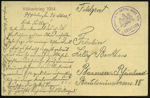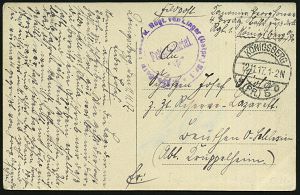 | 388 | 15 € | I. WELTKRIEG 1914 - 18 : DEUTSCHES REICH 1914 (26.11.) seltener 1K.: K.D. FELDPOSTEXPED./der/LANDW.-DIV./KÖNIGSBERG (PR)/** (Kat.Nr.1481) klar gest. Feldpost-Bf. n. Magdeburg | | |