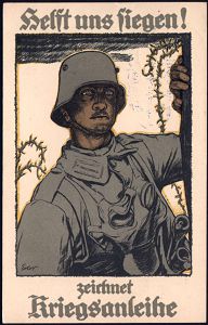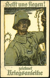 | 427 | 18 € | I. WELTKRIEG 1914 - 18 : DEUTSCHES REICH 1917 (11.4.) berühmte Color-Propaganda-Künstler-Ak: Helft uns siegen! zeichnet Kriegsanleihe = Infanterist mit Gasmaske, sign. (Fritz) Erler (1868-1940) berühmter Jugendstil-Maler, Graphiker , aptierte 1K-Brücke: Feldpost = Tarnstempel + viol. 2K-HdN: Sächs. Res.-Jnf.-Rgt. Masch.-Ge.(wehr)-Komp., klar gest. Feldpost-Kt. n. Chemnitz (Uhv.: Prof. Fritz Erler.., Berlin) | | |