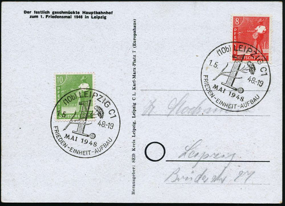 | 3716 | 20 € | SOWJETISCHE BESATZUNGSZONE (1945-49) : (10) LEIPZIG C1/ 1.MAI 1948/ FRIEDEN-EINHEIT-AUFBAU 1948 (1.5.) SSt = Nelke auf s/w.-Sonder-Kt.: 1. Friedensmai 1946 in Leipzig (HBhf mit Bebel-, Stalin-Bildern etc.) Michaelis unbekannt!, seltener Beleg! (Bo.213) | | |