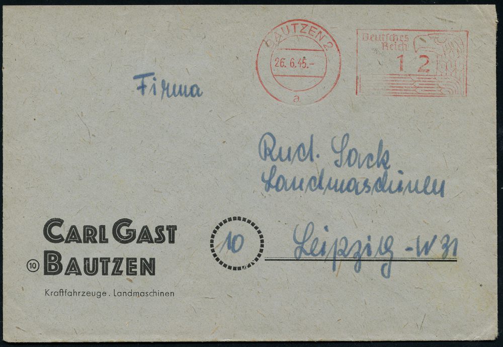 | 3696 | 30 € | SOWJETISCHE BESATZUNGSZONE (1945-49) : BAUTZEN 2/ Deutsches/ Reich 1945 (26.6.) aptierter PFS "Adlerkopf/Hakenkreuz" (Hakenkreuz entfernt) 12 Pf. = Notmaßnahme , seltener, sehr früher Firmen-Bf.: CARL GAST.. Kraftfahrzeuge.. (frühestes Datum = 18.6.) n. Leipzig (Dü.D-8, Nr.225) | | |