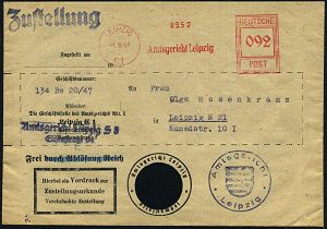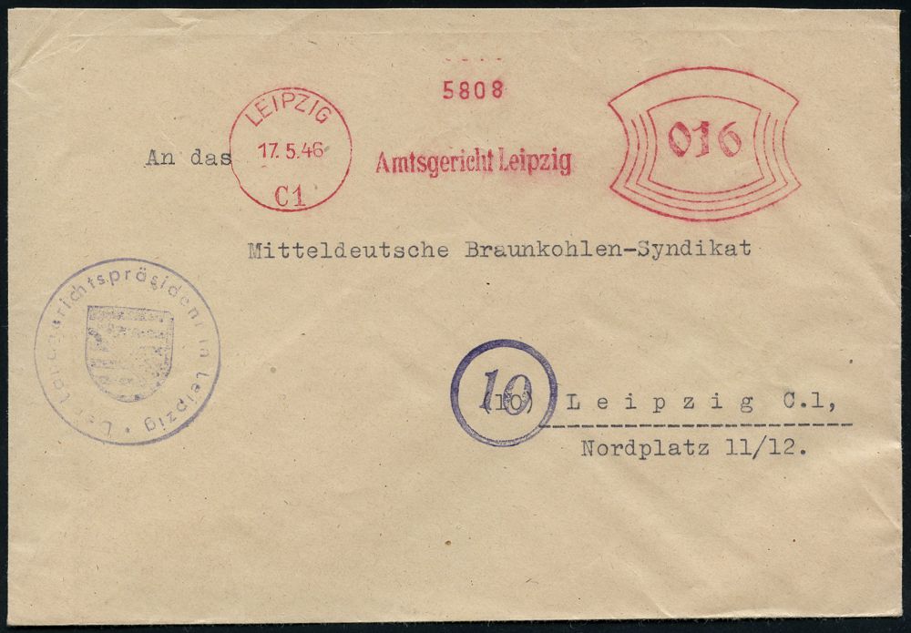 | 3715 | 25 € | SOWJETISCHE BESATZUNGSZONE (1945-49) : LEIPZIG/ C 1/ Amtsgericht.. 1947 (1.8.) AFS Francotyp "Hochrechteck" 092 Pf. + 1L: Zustellung , entnazifizierter Dienst-Bf.: Frei durch Ablösung Reich (gestrichen) Amtsgericht Leipzig, NS-Adler ausgeschnitten, Orts-ZU., seltene Portostufe!, Götz + 80.- DM (Dü.E-18BAh) | | |