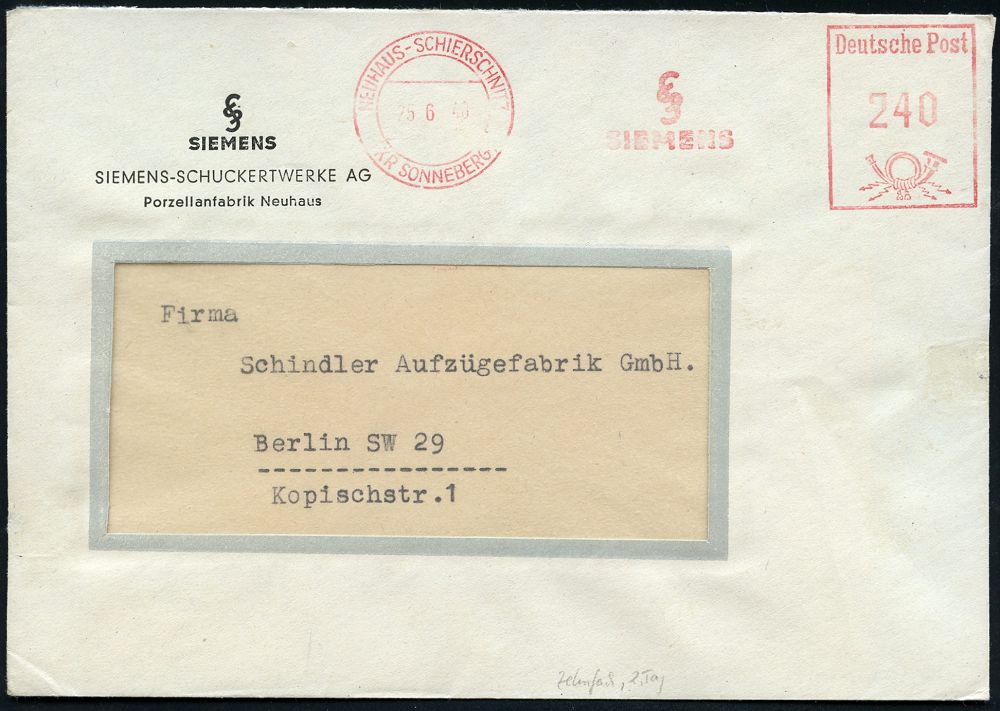| 3721 | 120 € | SOWJETISCHE BESATZUNGSZONE (1945-49) : NEUHAUS-SCHIERSCHNITZ/ (KR SONNEBERG)/ S/ S/ SIEMENS 1948 (25.6.) sehr seltener AFS Francotyp "Posthorn" 240 Pf. Zehnfach-Frankatur = Währungsreform! , Firmen-Bf.: SIEMENS (Mi.ZF 5 a, + 250.- EUR) | | |