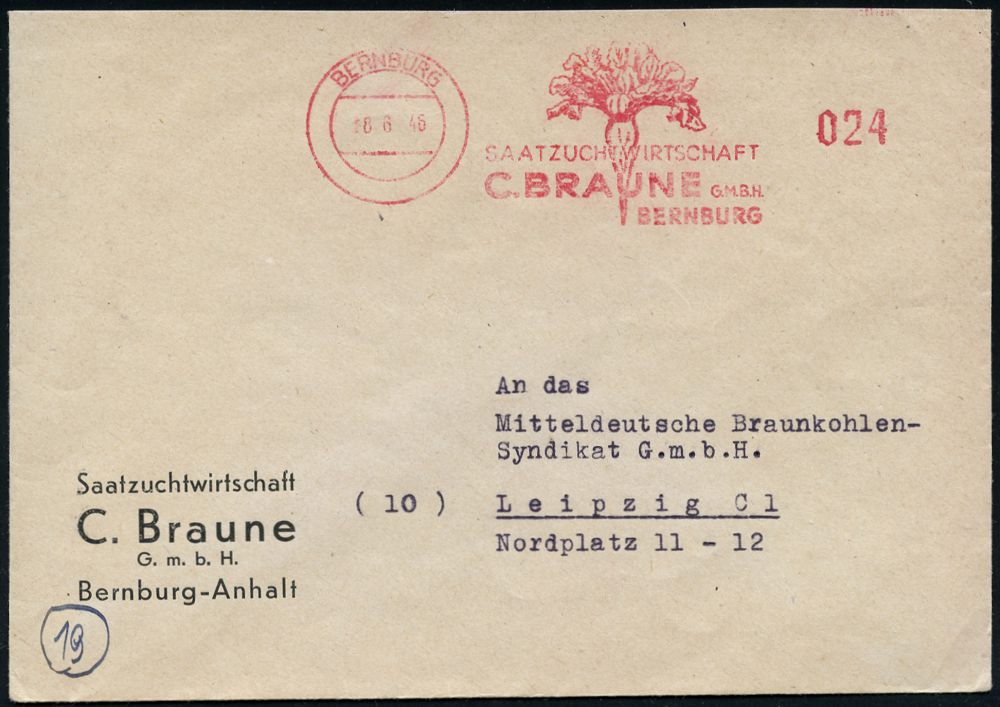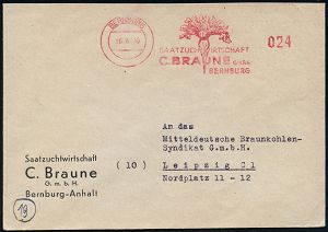 | 3697 | 25 € | SOWJETISCHE BESATZUNGSZONE (1945-49) : BERNBURG/ SAATZUCHTWIRTSCHAFT/ C.BRAUNE GmBH.. 1946 (8.6.) seltener, total apzierter AFS Francotyp = Wertrahmen kompl. entfernt = Notmaßnahme! (Zuckerrübe) Firmen-Fern-Bf. n. Leipzig (Dü.E-16CGo) | | |