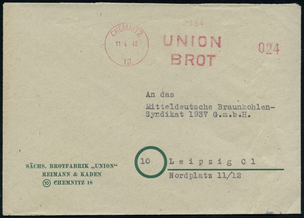 | 3699 | 20 € | SOWJETISCHE BESATZUNGSZONE (1945-49) : CHEMNITZ/ 13/ UNION/ BROT 1946 (11.4.) total aptierter AFS Francotyp = Wertrahmen kompl. entfernt = Notmaßnahme! , Firmen-Bf.: SÄCHS. BROTFABRIK "UNION", REIMANN & KADEN.. n. Leipzig (Dü.E-16CGh) | | |