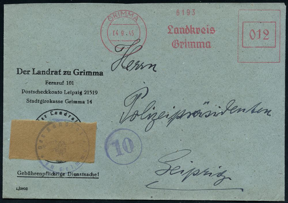 | 3708 | 20 € | SOWJETISCHE BESATZUNGSZONE (1945-49) : GRIMMA/ Landkreis/ Grimma 1945 (4.9.) aptierter AFS Francotyp "Reichsadler" = entfernt + Inschrift "Deutsche Reichspost" = Notmaßnahme! , relativ früher, entnazifizierter Polizei-Dienst-Bf.: Der Landrat.. = NS-Symbole überklebt! n. Leipzig (Dü.E-13AK-127h) | | |