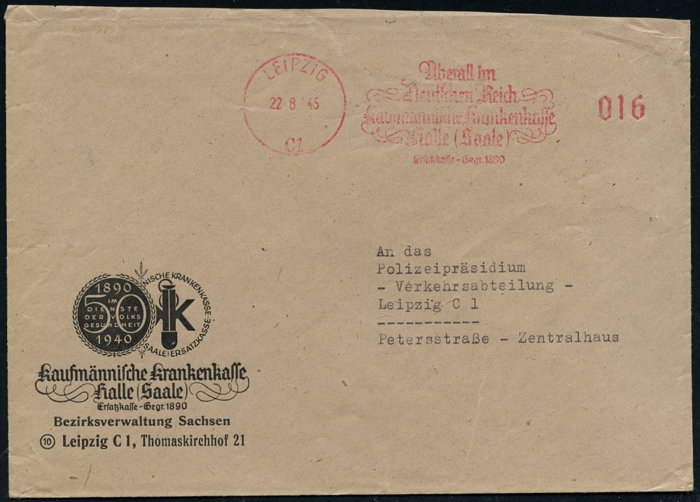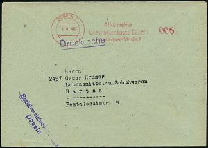 | 3712 | 25 € | SOWJETISCHE BESATZUNGSZONE (1945-49) : LEIPZIG/ C1/ Überall im/ Deutschen Reich/ Kaufmännische Krankenkasse/ Halle.. 1945 (22.8.) seltener, total aptierter AFS "Reichsadler" = Wertrahmen kompl. entfernt = Notmaßnahme! , aber a l t e r Text im Klischee! , alter Jubil.-Umschlag "50 Jahre 1890 - 1940" (Logo) interess., früher Orts-Bf.! (Dü.E-16CGo) | | |