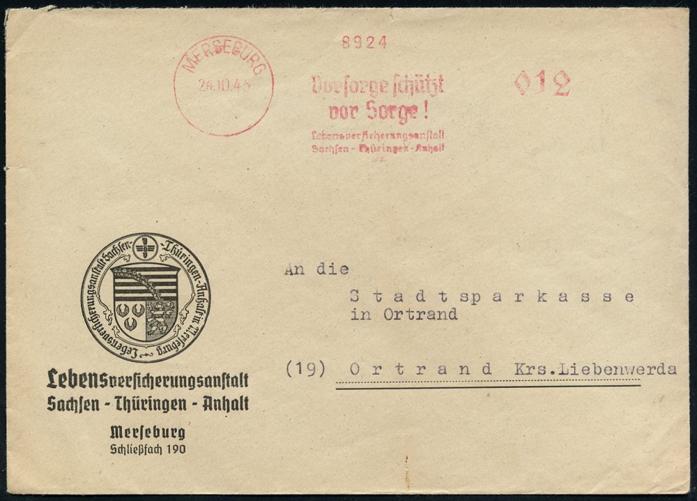 | 3719 | 20 € | SOWJETISCHE BESATZUNGSZONE (1945-49) : MERSEBURG/ Vorsorge schützt/ vor Sorge!/ Lebersversicherungsanstalt/ Sachsen-Thüringen-Anhalt 1945 (24.10.) total aptierter AFS Francotyp = Wertrahmen kompl. entfernt = Notmaßnahme! auf illustriertem Vordruck-Bf.: Lebensversicherungsanstalt.. (Wappen) n. Ortrand (Dü.E-16BAh) | | |