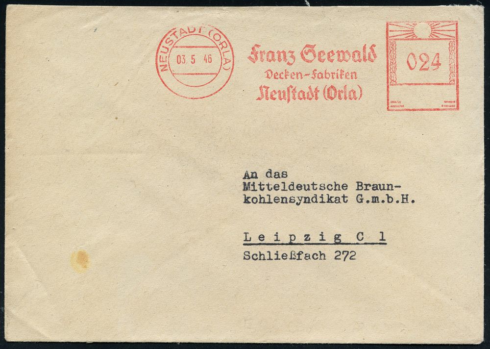 | 3722 | 25 € | SOWJETISCHE BESATZUNGSZONE (1945-49) : NEUSTADT (ORLA)/ Franz Seewald/ Decken-Fabriken.. 1946 (3.5.) seltener, aptierter AFS Francotyp "Hakenkreuz" = entfernt + Inschrift "Deutsches Reich" = Notmaßnahme! , klar gest. Fern-Bf. n. Leipzig (Dü.E-12 Q - 98o = sehr seltene Type!) | | |