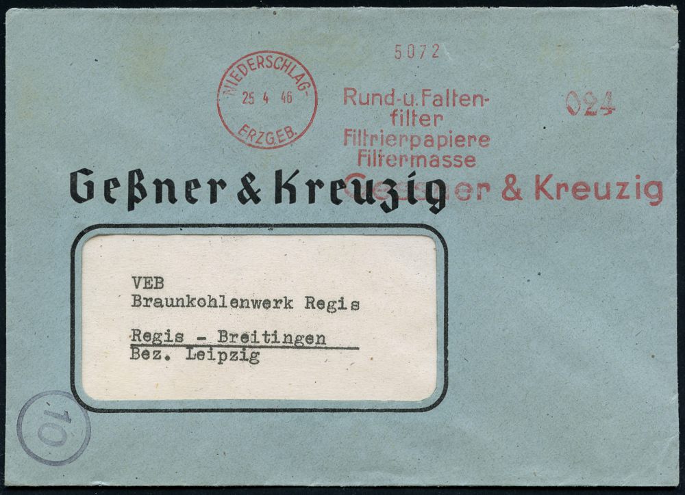 | 3723 | 25 € | SOWJETISCHE BESATZUNGSZONE (1945-49) : NIEDERSCHLAG/ ERZGEB./ Rund-u./ Faltenfilter/ Filtrierpapiere../ Geßner & Kreuzig 1946 (25.4.) total aptierter AFS Francotyp = Wertrahmen kompl. entfernt = Notmaßnahme! , Fern-Firmen-Bf. (Dü.E-16CEh) | | |