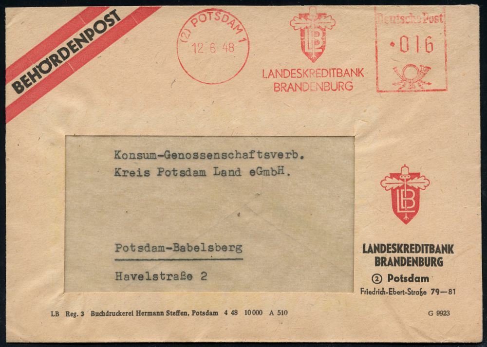 | 3725 | 18 € | SOWJETISCHE BESATZUNGSZONE (1945-49) : (2) POTSDAM 1/ LB/ LANDESKREDITBANK/ BRANDENBURG 1948 (12.6.) AFS Francotyp (Logo mit Eichel) motivgl. Dienst-Bf.: BEHÖRDENPOST LANDESKREDITBANK.. = Landeskreditanstalt für Wiederaufbau analog zum Westen! (Dü.E-20DG) | | |