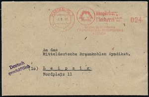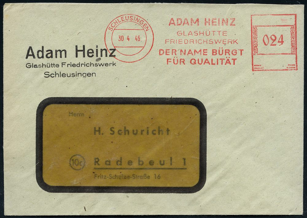 | 3726 | 25 € | SOWJETISCHE BESATZUNGSZONE (1945-49) : schleusingen7adam heinz7glashütte7friedrichswerk.. 1946 (30.4.) seltener, aptierter AFS Francotyp "Hakenkreuz" = entfernt + Inaschrift "Deutsches Reich" = Notmaßnahme! , Firmen-Fern-Bf. (Dü.E-12Y-98o = seltene Type!) | | |