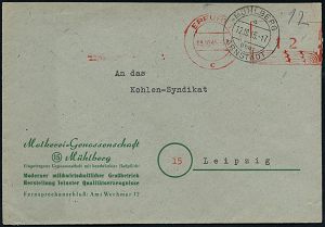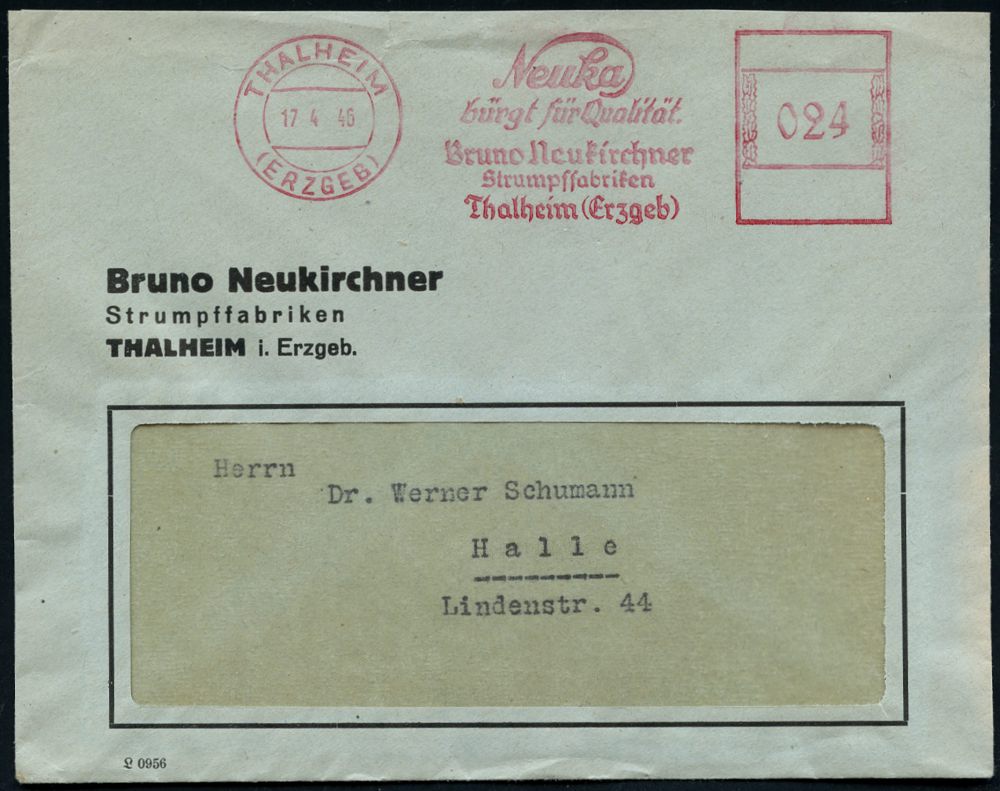 | 3728 | 20 € | SOWJETISCHE BESATZUNGSZONE (1945-49) : THALHEIM/ (ERZGEB)/ Neuka/ ..Bruno Neukirchner/ Strumpffabriken.. 1946 (17.4.) seltener, aptierter AFS Francotyp "Hakenkreuz" = entfernt + Inschrift "Deutsches Reich" = Notmaßnahme! , Firmen-Bf. (oben kl. Rißchen) klar gest.! (Dü.E-12AA-98o = seltene Type) | | |