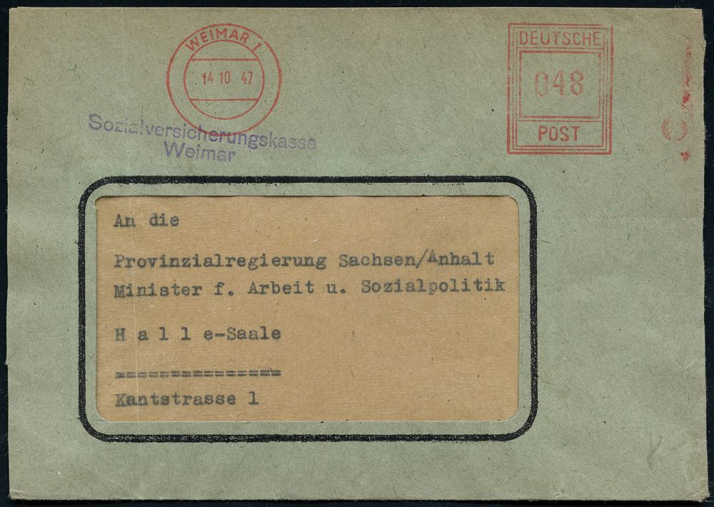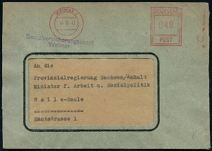 | 3729 | 18 € | SOWJETISCHE BESATZUNGSZONE (1945-49) : WEIMAR 1 1947 (14.10.) seltener, aptierter AFS Francotyp "Hochrechteck" o h n e Werbeklischee + viol. Abs.-2L: Sozialversicherungskasse/Weimar , Fern-Dienst-Bf. (Dü.E-18CG ohne Werbeklischee) | | |