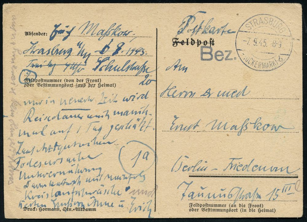 | 3727 | 30 € | SOWJETISCHE BESATZUNGSZONE (1945-49) : STRASBURG/ (UCKERMARK)/ b 1945 (7.9.) b l a u e 1K-Brücke + viol. 1L: B e z.(ahlt) , frühe, aptierte Feldpost-Kt. n. West-Berlin !, seltener Beleg! | | |