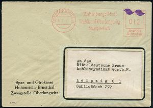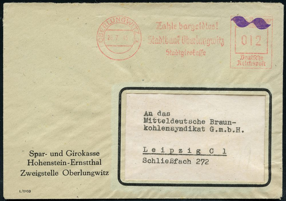 | 3724 | 75 € | SOWJETISCHE BESATZUNGSZONE (1945-49) : OBERLUNGWITZ 1/ Zahle bargeldlos!/ Stadtbank Oberlungwitz.. 1945 (26.7.) sehr seltener AFS Francotyp "Reichsadler" mit violetter T i l d e überstempelt!, Dürst-Eich-Katalog unbekannt! , Firmen-Fern-Bf., sign. LOKNOT (Dürst unbekannt = Unikat !) | | |