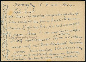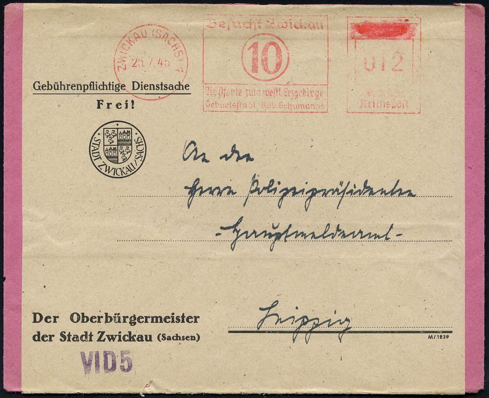 | 3731 | 40 € | SOWJETISCHE BESATZUNGSZONE (1945-49) : ZWICKAU (SACHS) 1/ Besucht Zwickau/ (10)/ ..Geburtsstadt Robert Schumanns 1945 (25.7.) sehr seltener. aptierter AFS Francotyp "Reichsadler" mit roter Farbe unkenntlich gemacht = Notmaßnahme! , sehr früher, kommunaler Nachkriegs-Fern-Bf.: Der Oberbürgermeister.. (unten kl. Kerbe) n. Leipzig (Dü.E-13D-129o = seltene Variante!) | | |