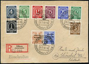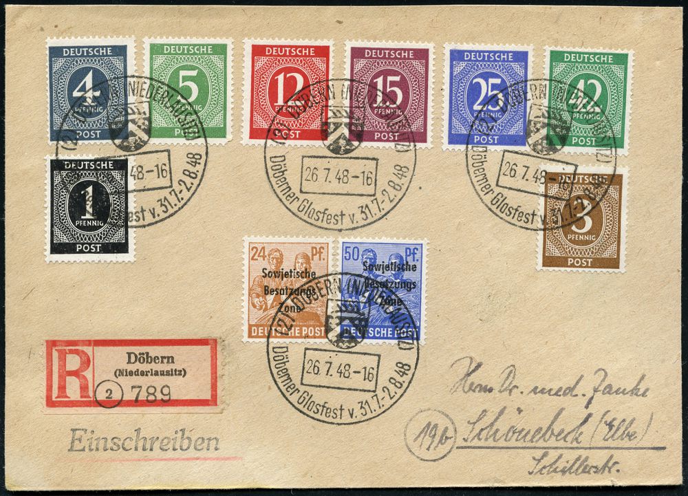 | 3701 | 20 € | SOWJETISCHE BESATZUNGSZONE (1945-49) : (2) DÖBERN (NIEDERLAUSITZ)/ Döbelner Glasfest 1948 (26.7.) HWSt (Stadtwappen mit Schnapsglas) 4 x + RZ: (2) Döbern/(Niederlausitz), klar gest. Inl.-R-Bf. (Bo.1) | | |