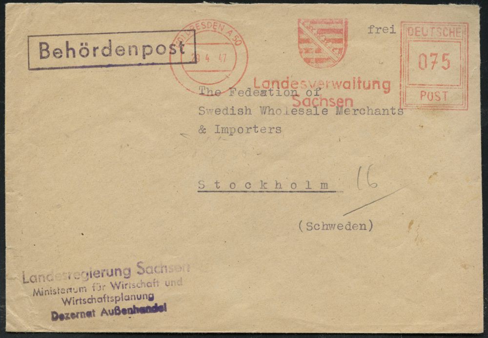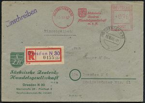 | 3702 | 25 € | SOWJETISCHE BESATZUNGSZONE (1945-49) : (10) DRESDEN A 50/ Landesverwaltung/ Sachsen 1947 (29.4.) AFS Francotyp "Hochrechteck" = Landeswappen, o75 Pf. die Länder wurden in dder DDR 1953 abgeschafft + Ra.: Behördenpost + Abs.-4L: Landesregierung Sachsen/ Minister für Wirtschaft u./Wirtschaftsplanung/ Dezernent Außenhandel, klar gest. Ausl.-Bf. n. Schweden, seltene Portostufe! (Dü.E-18CG, nur ca. 1 1/2 Jahre verwendet!) | | |