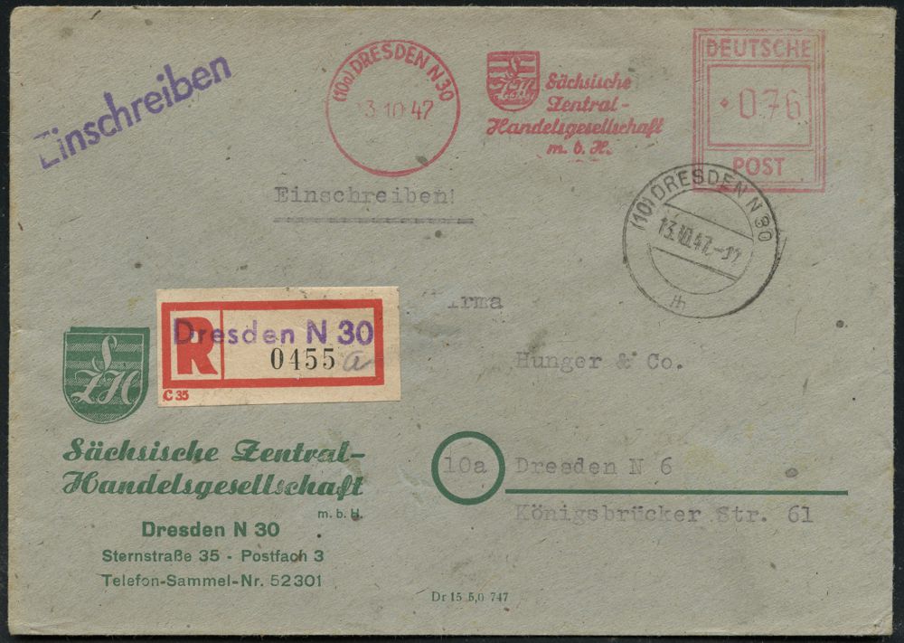 | 3704 | 23 € | SOWJETISCHE BESATZUNGSZONE (1945-49) : (10a) DRESDEN N 30/ Sächsische/ Zentral-/ Handelsgesellschaft.. 1947 (3.10.) AFS Francotyp "Hochrechteck" 076 Pf. (Wappen) + provis. RZ: Dresden N 30 + hs. UB "a" , motivgl. Firmen-Orts-R-Bf. (Dü.E-18DGo, nur ca. 1 1/2 Jahre verwendet!) | | |