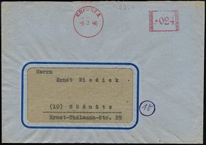 | 3706 | 25 € | SOWJETISCHE BESATZUNGSZONE (1945-49) : ERFURT/ 1 1946 (9.3.) total aptierter AFS "Hakenkreuz" = vom Wertrahmen nur Mittelstück + Werbeklischee entfernt = Notmaßnahme! , rs. Abs.-Vordr.: OLYMPIA BÜROMASCHINENWERKE AG (wurdde enteignet!), Fern-Bf., (Eich.E-12 M-75h = sehr seltene Type) | | |