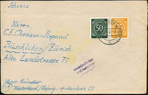 | 3730 | 16 € | SOWJETISCHE BESATZUNGSZONE (1945-49) : WIEDERITZSCH (KR LEIPZIG)/ c 1947 (21.2.) 2K-Steg + amtl. HdN: Bundesland Sachsen/sowjetische Zone/"Deutschland" , Bedarfs-Ausl.-Bf. (kl. Randrißchen, Fleck) n. Zürich Bundesländer wurden 1952 abgeschafft (Mi.927, 932) | | |