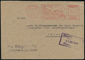 | 3717 | 20 € | SOWJETISCHE BESATZUNGSZONE (1945-49) : LEISNIG/ Die Stadt auf dem Berge/ Die Stadt der Baumblüte/ Stadtverwaltung 1945 (18.7.) AFS Francotyp "Reichsadler" unverändert! weiterverwendet, in der SBZ sehr selten! + viol. Abs.-2L, kommunaler Fern-Bf. n. Chemnitz (Dü.E-CGo, unverändert !) | | |