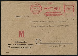 | 3698 | 25 € | SOWJETISCHE BESATZUNGSZONE (1945-49) : DITTERSDORF/ bei CHEMNITZ/ Dittersdorfer Filz.. 1946 (30.4.) seltener, aptierter AFS Francotyp "Hakenkreuz" = entfernt + Inschrift "Deutsches Reich" = Notmaßnahme! , Firmen-Bf.: Dittersdorfer Filz- u. Kratzentuch-Fabrik.. n. Leipzig (Dü.E-12AA-98h) | | |