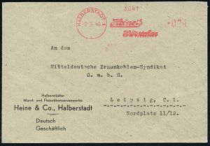 | 3709 | 25 € | SOWJETISCHE BESATZUNGSZONE (1945-49) : HALBERSTADT 1/ Heine´s/ Würstchen 1946 (2.5.) total aptierter AFS Francotyp = Wertrahmen kompl. entfernt = Notmaßnahme! , Firmen-Bf.: Wurst- u. Fleischkonservenwerke, Heine & Co.. n. Leipzig (Dü.E-16DGh) | | |