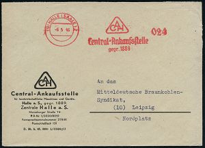 | 3710 | 25 € | SOWJETISCHE BESATZUNGSZONE (1945-49) : (19) HALLE (SAALE) 2/ CAH/ Central-Ankaufstelle/ gegr.1889 1946 (6.5.) total aptierter AFS Francotyp = Wertrahmen kompl. entfernt = Notmaßnahme! (Firmen-Monogr.) motivgl. Firmen-Bf.: Central-Ankaufsstelle für landwirtschaft. Maschinen u. Geräte.. n. Leipzig (Dü.E-16CAo = seltene Type!) | | |