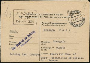 | 3707 | 18 € | SOWJETISCHE BESATZUNGSZONE (1945-49) : GEISING/ (BEZIRK DRESDEN) 1946 (3.9.) 2K-Steg + viol. 2L: Der Stadtrat Geising/ Polizeiamt , Kgf.-Vordruck-Bf. (deutsch-französ. Vordruck) interss. Inhalt: über Flüchtlinge aus Teplitz an dt.Kgf.-Lager Ft. Corneilles, Frankreich, Ra.3: CENSURE/No 501/Dépôt 221, seltener Beleg | | |