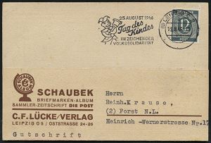 | 3714 | 25 € | SOWJETISCHE BESATZUNGSZONE (1945-49) : (10) LEIPZIG C 2/ a/ 25.AUGUST 1946/ Tag des/ Kindes.. 1946 (5.8.) seltener MWSt = Kaspar mit Glocke (u. Narrenkappe) Firmen-Kt.: SCHAUBEK BRIEFMARKEN-ALBUM, SAMMLER-ZEITSCHRIFT DIE POST.. (berühmte Album-Fabrik), Bedarf mit diesem Stempel = sehr selten! (Bo.190 A I) | | |